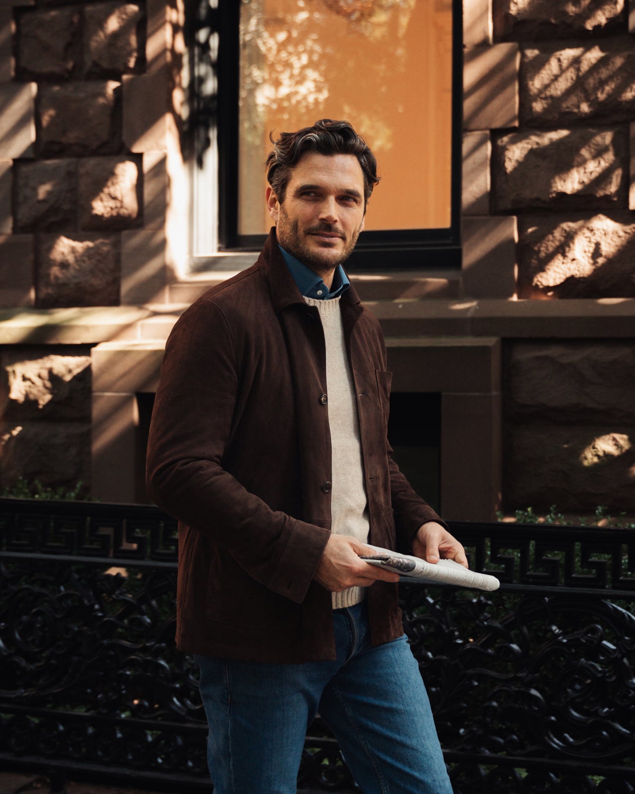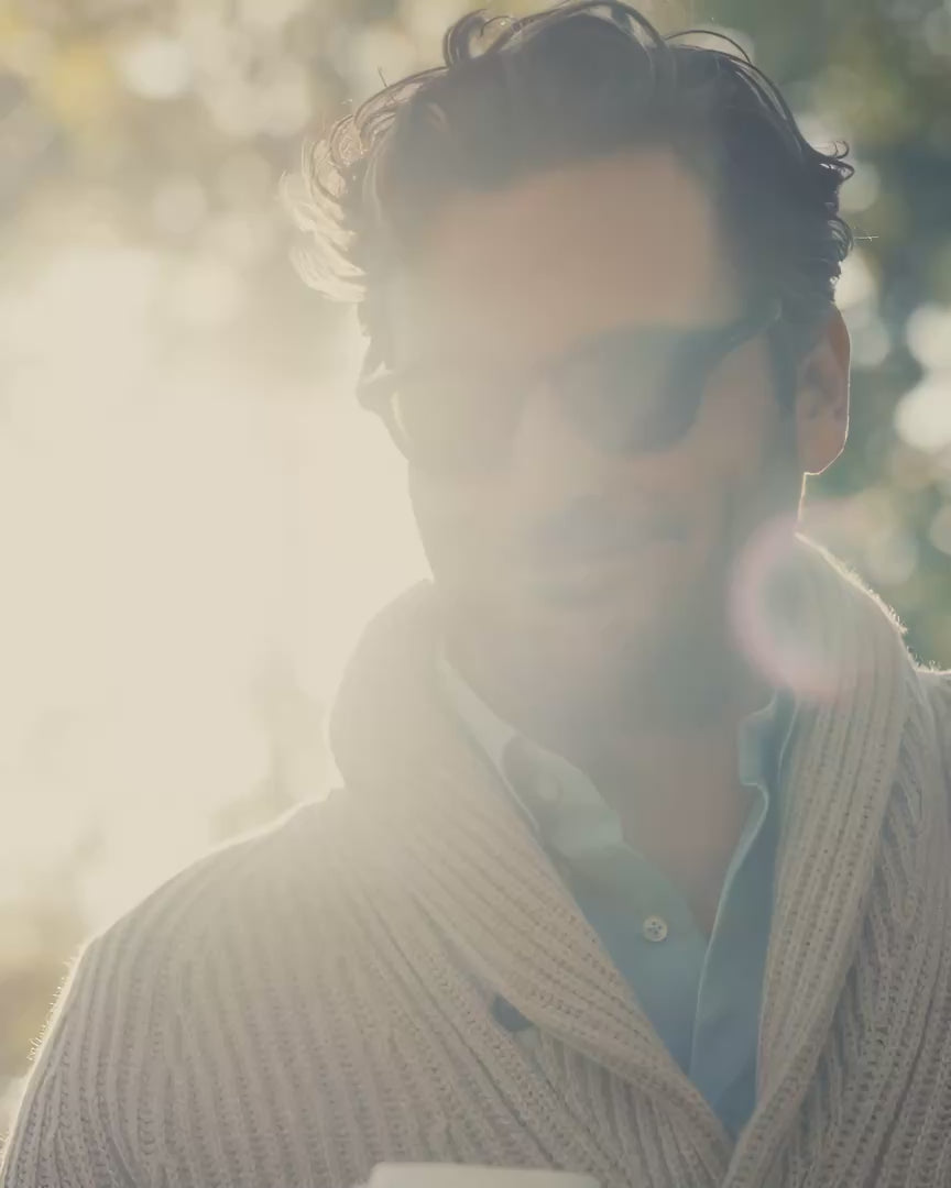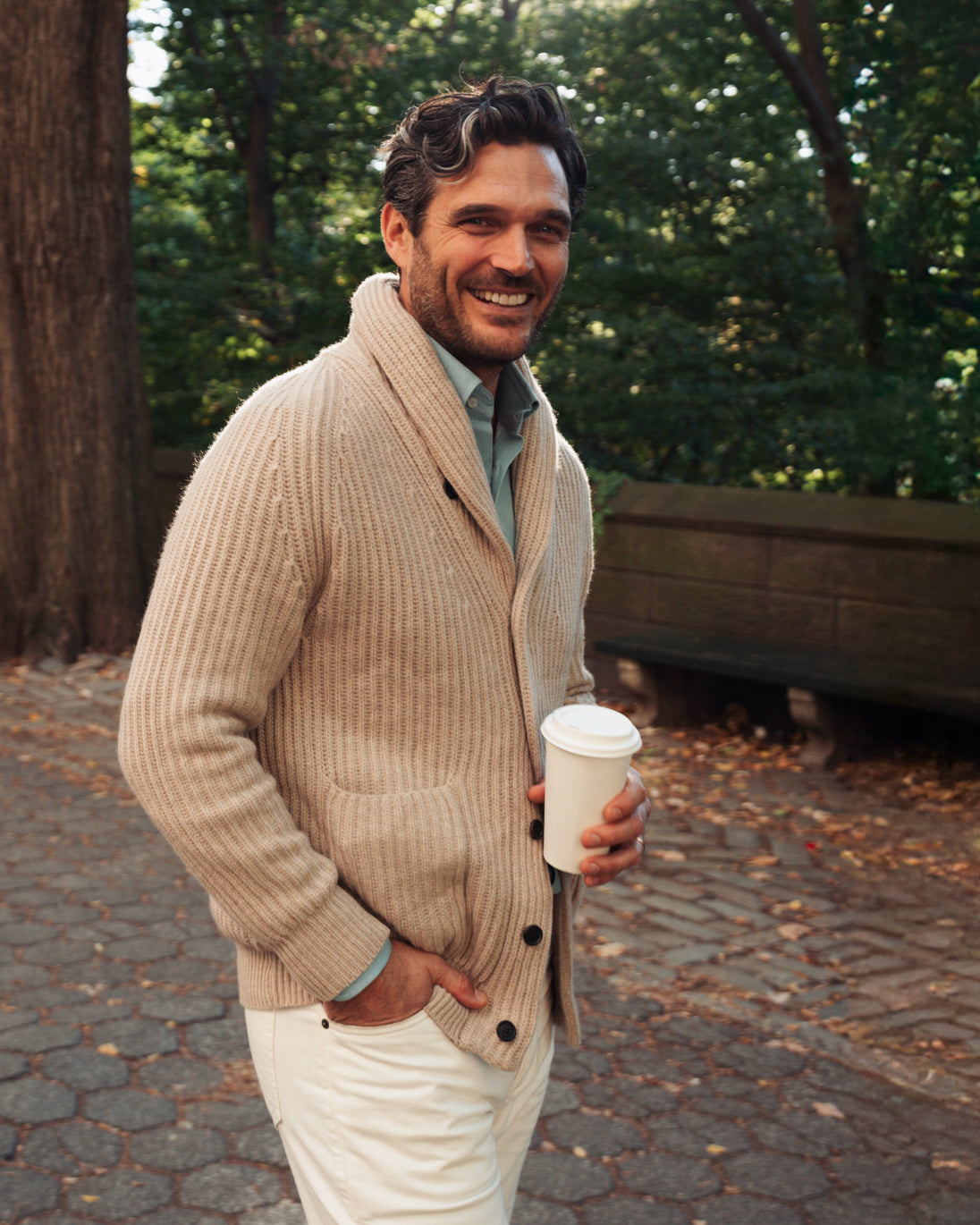 Jislain strolls through the iconic, lush Central Park wearing our chunky knitted shawl-collar cardigan, Tempo Runners, and light denim twill.