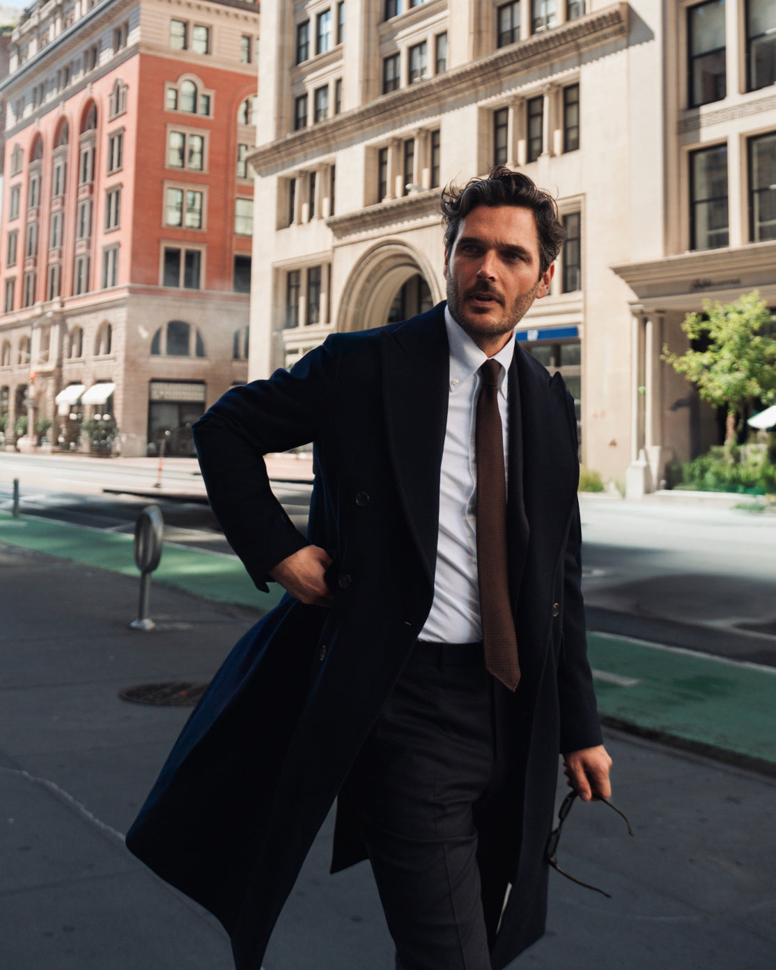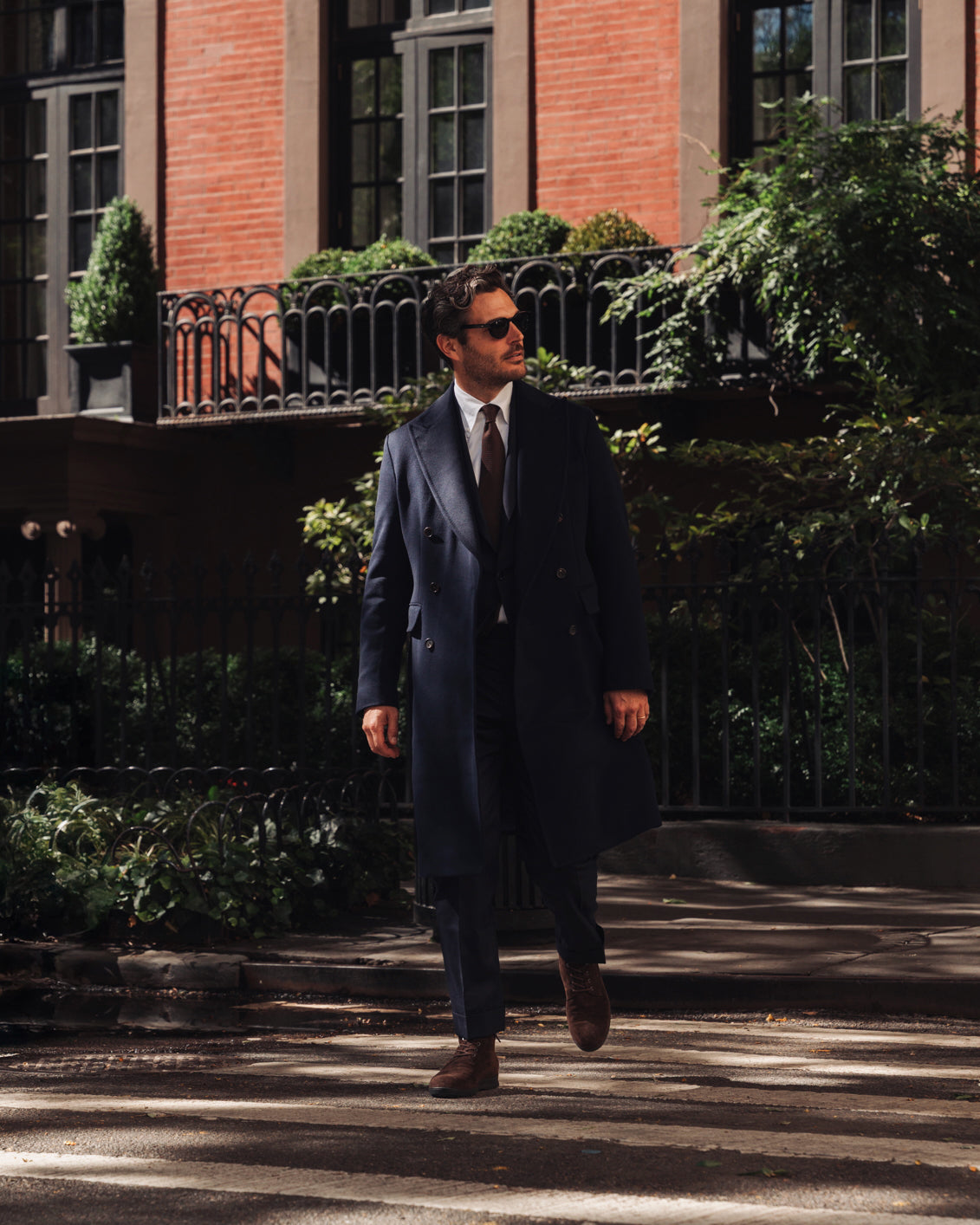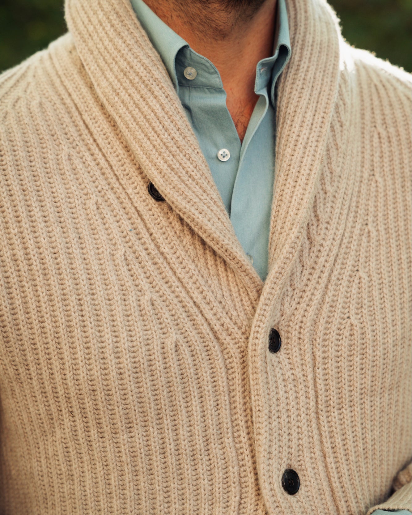Jislain strolls through the iconic, lush Central Park wearing our chunky knitted shawl-collar cardigan, Tempo Runners, and light denim twill.