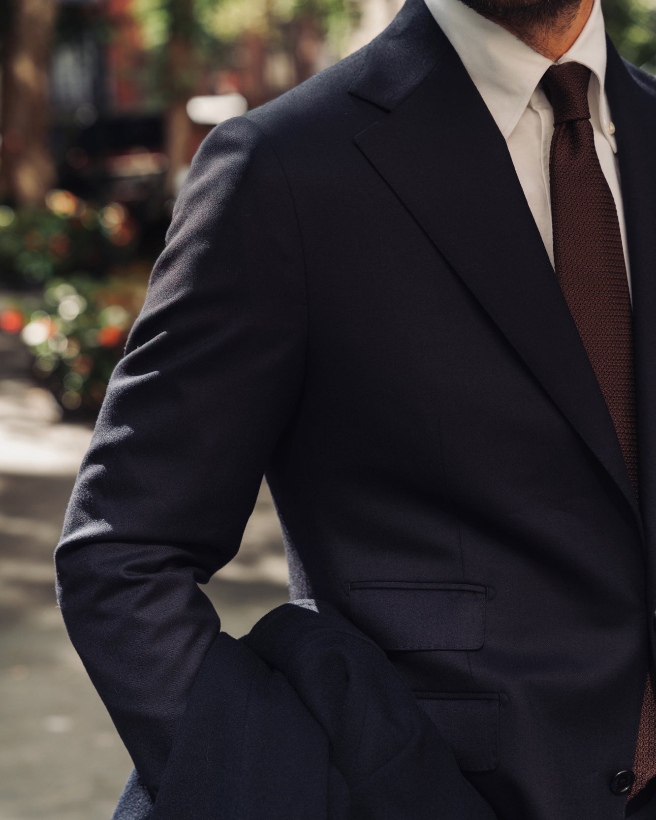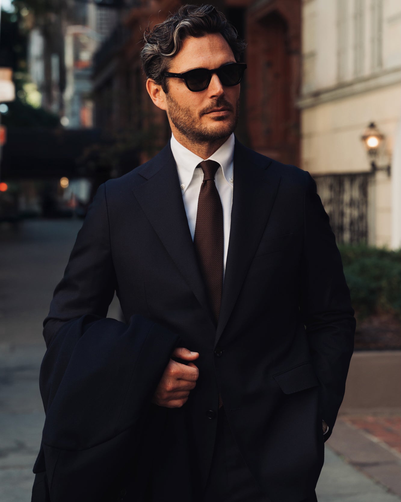 He wears our house-cut suit in brushed wool, paired with a crisp, smart-casual button-down Oxford shirt and a silk grenadine tie.