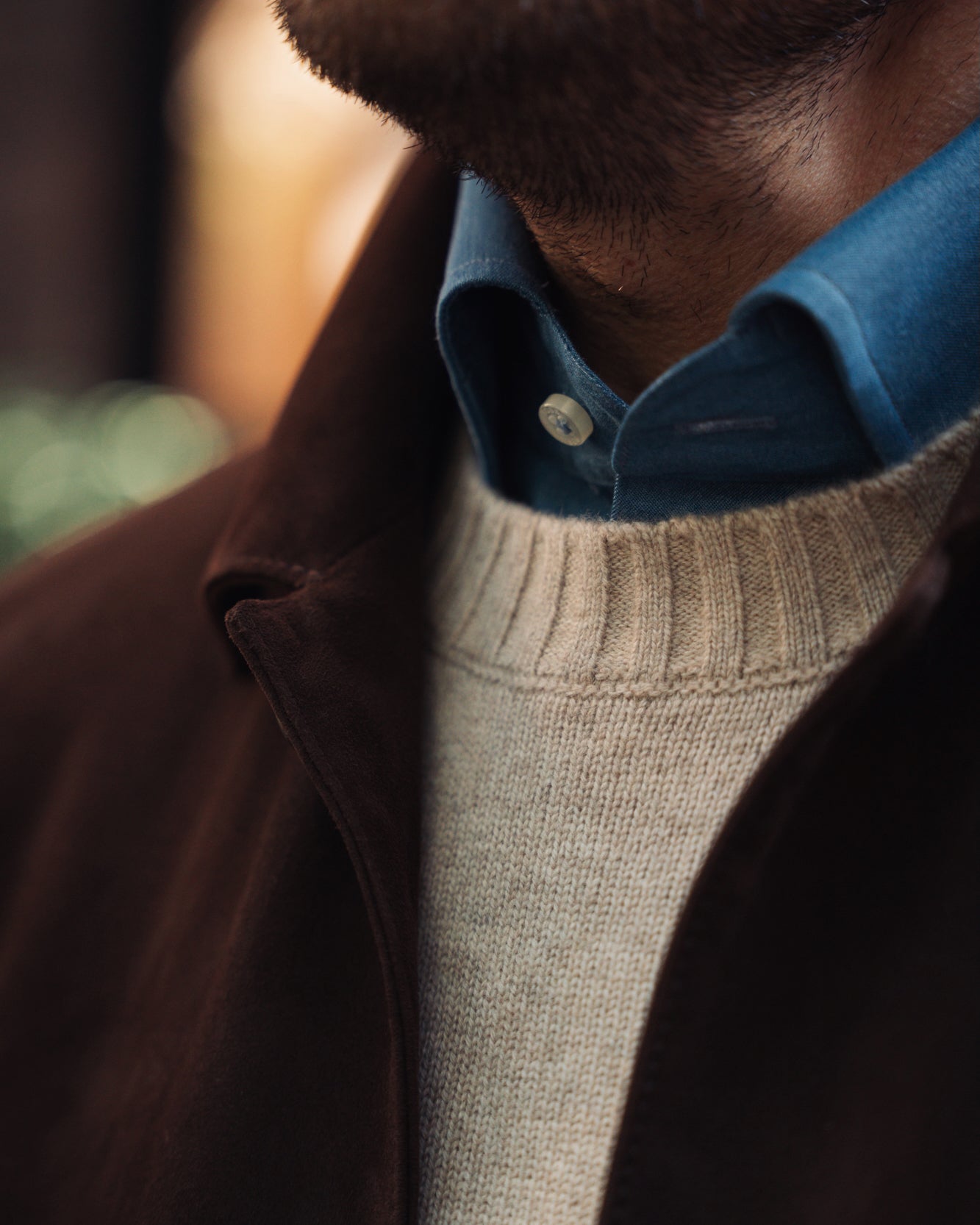 Worn underneath is our soft, mid-weight cashmere crewneck, paired with the ever-essential denim shirt and jeans.