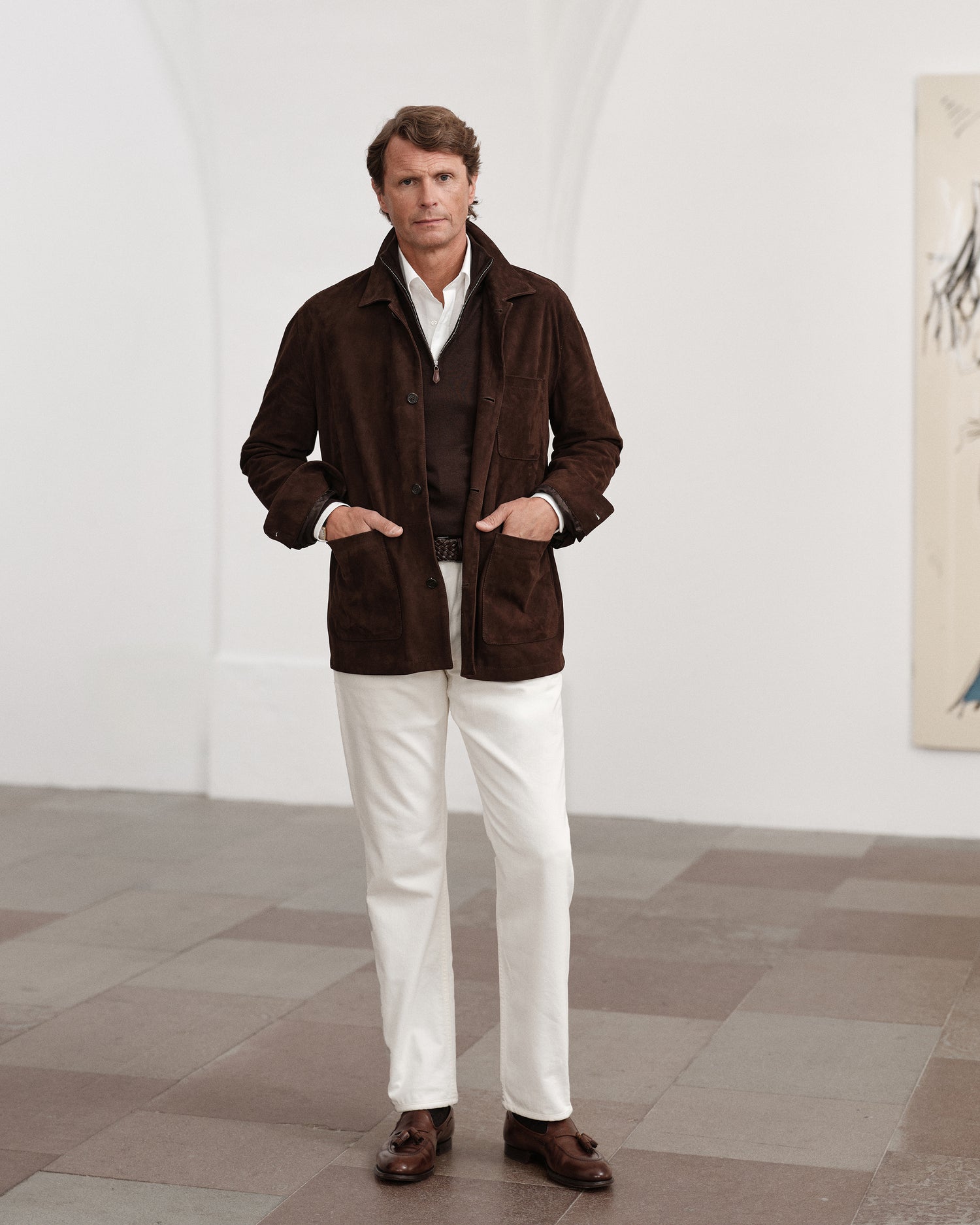 The suede overshirt was born from the idea of creating a refined interpretation of the iconic French workwear jacket. A modern and versatile garment that still gives a subtle nod to its design heritage and can be worn with anything. Straight lines and seams are complemented by gentle curves and finished with delicate horn buttons.