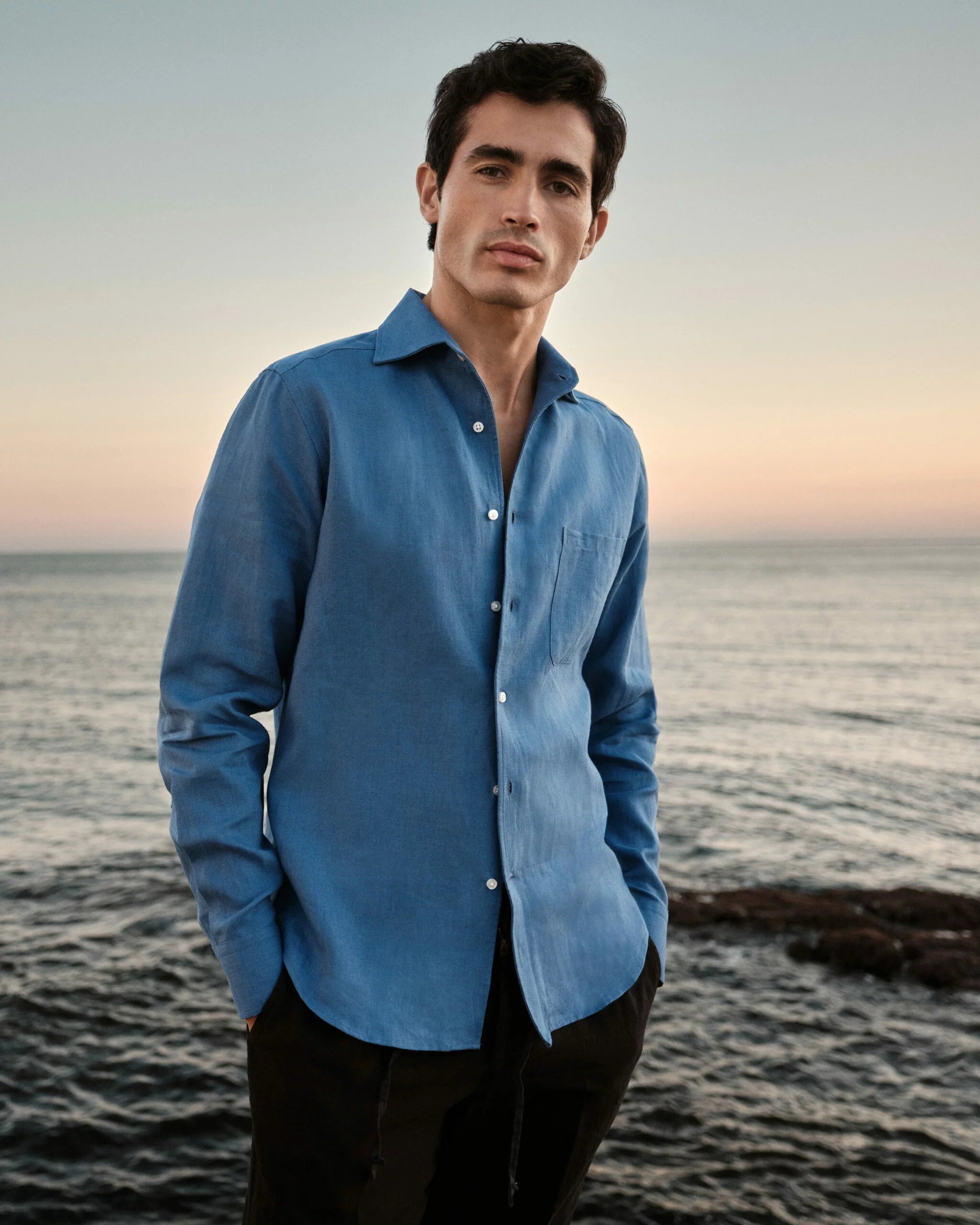 Designed with a timeless, well-proportioned one-piece collar and a gently curved chest pocket, this shirt is made to be worn buttoned by the middle button for the beach while remaining classy under a crisp linen jacket.