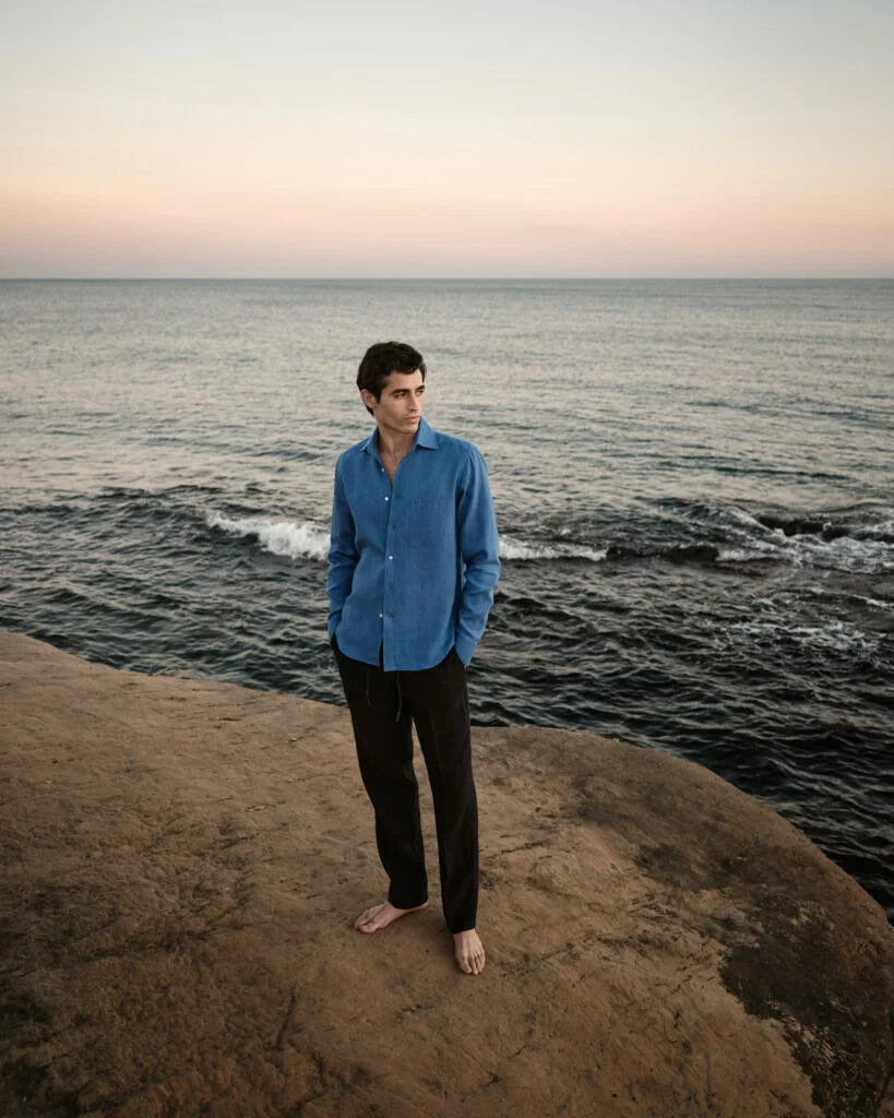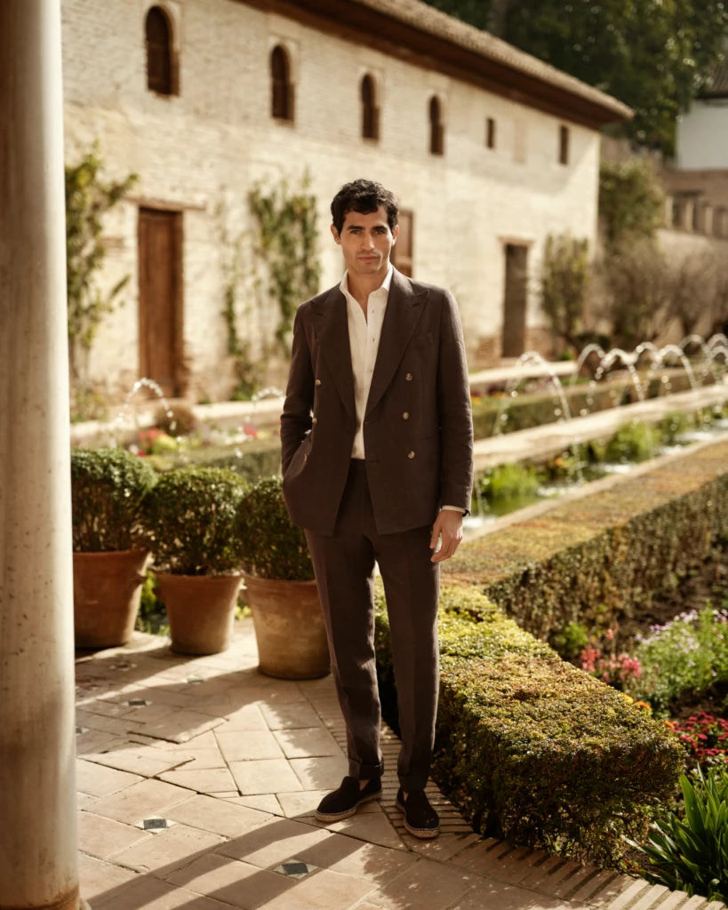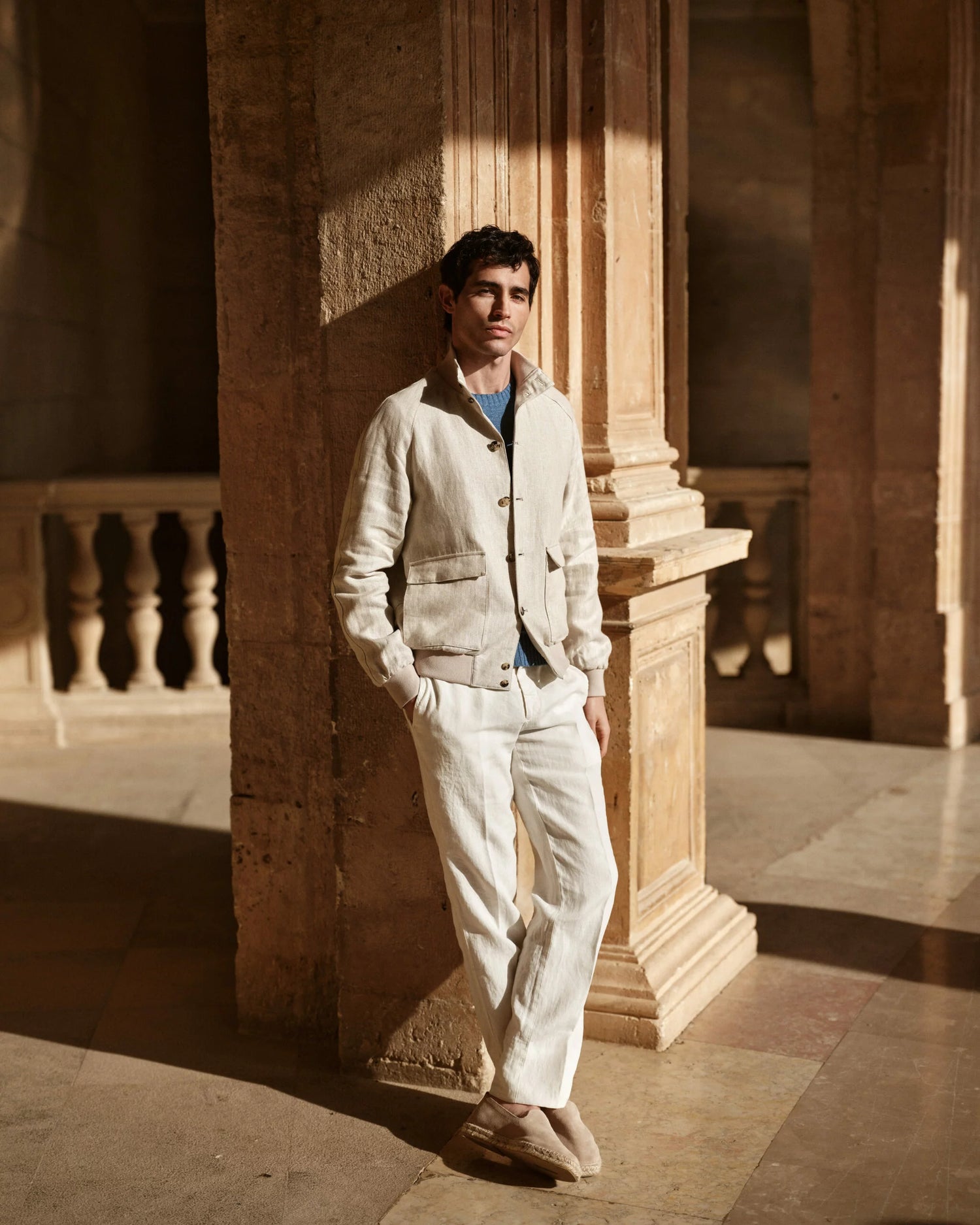 Proportions and styles are borrowed from the historic days of the Spanish, French and Italian rivieras, refined and updated in a comfortable make. Classic, wide, double-breasted lapels are paired with effortless linen drawstring trousers and shirts worn with three buttons open: a tasteful look that conveys casual elegance at the core.