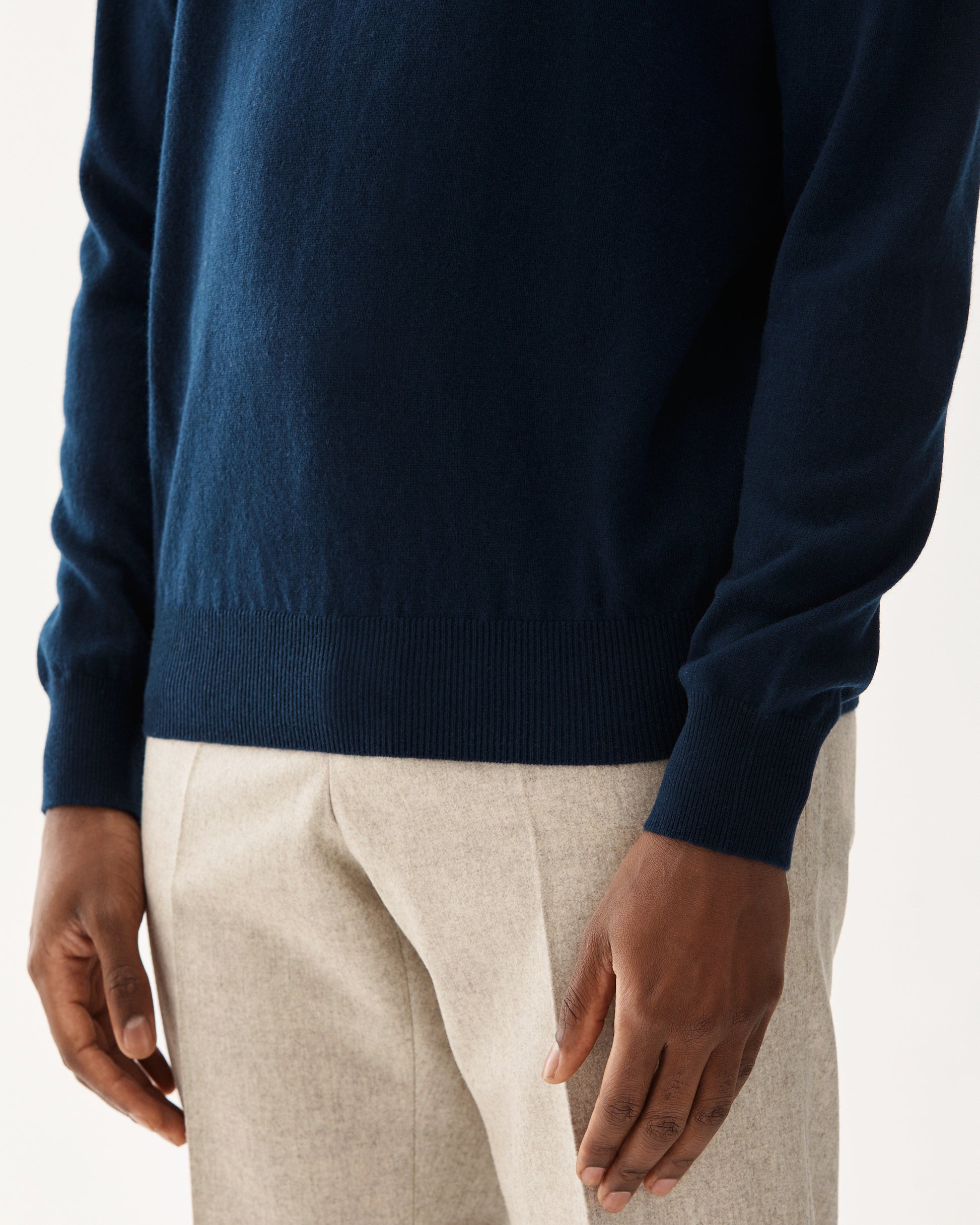 Our merino wool/ cashmere blend crew neck knits feature an elegant slightly wider neckline and ribbed endings. Easily combined with your favorite denims & gilet or worn just as well under a tailored jacket when an extra layer is needed. Model is 189cm tall, weighs 80kg and wears size 50.