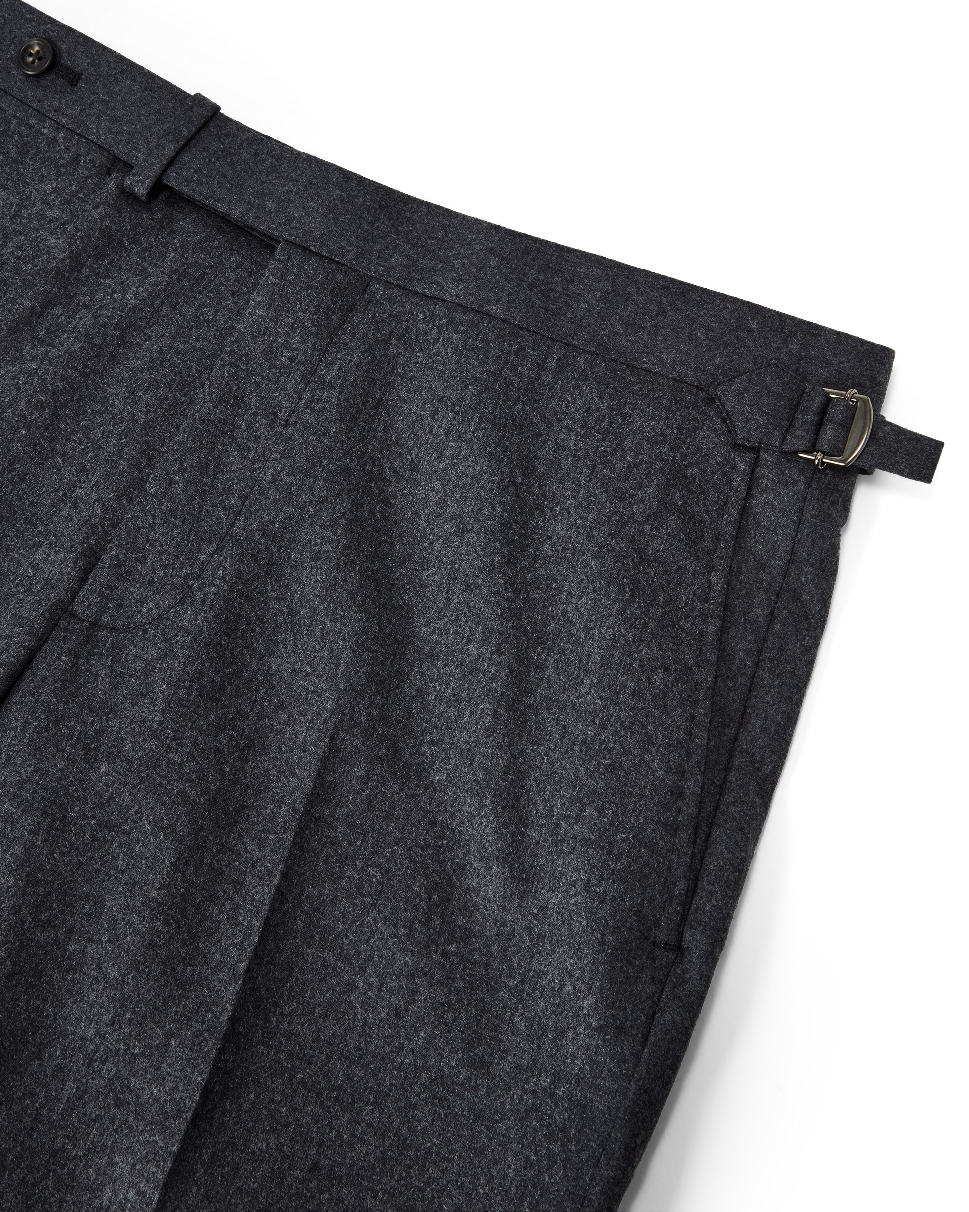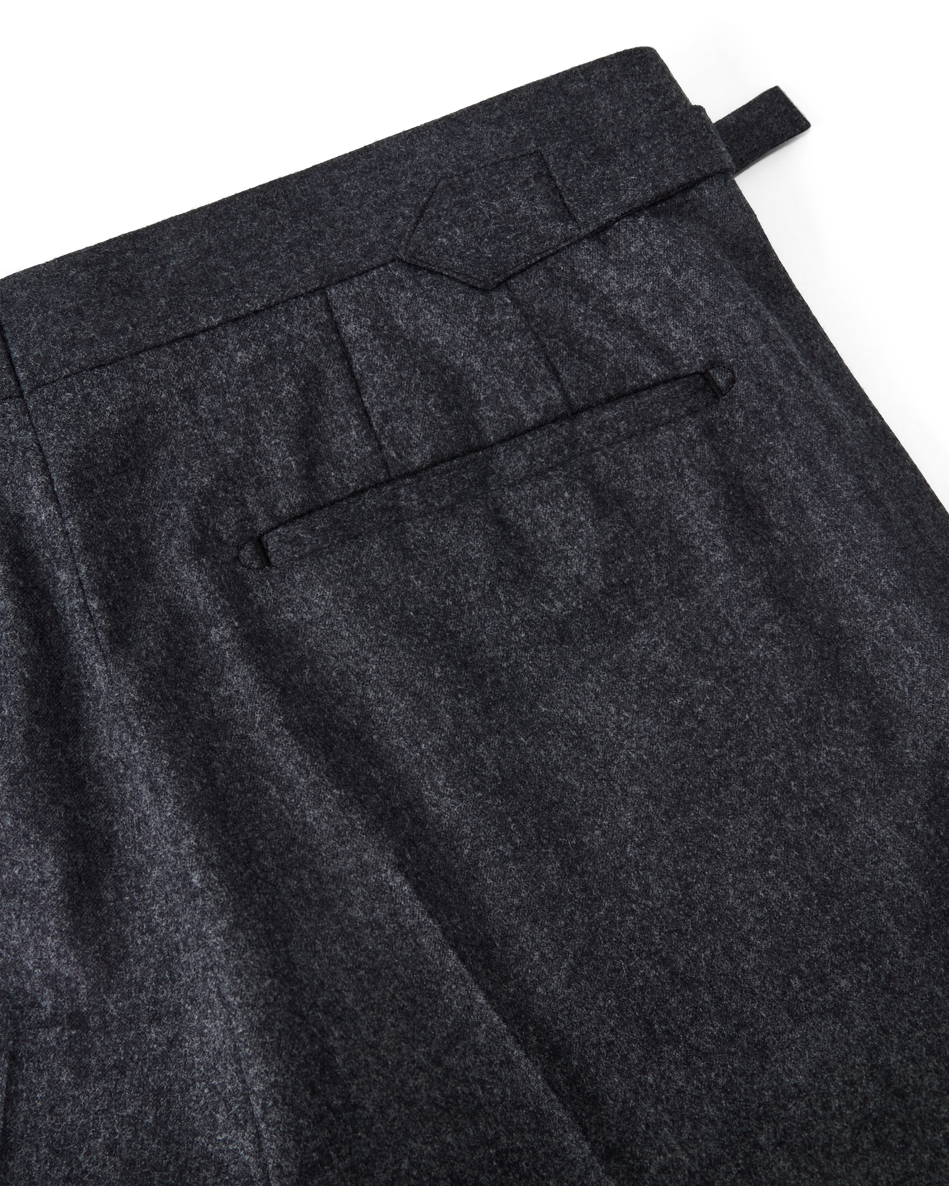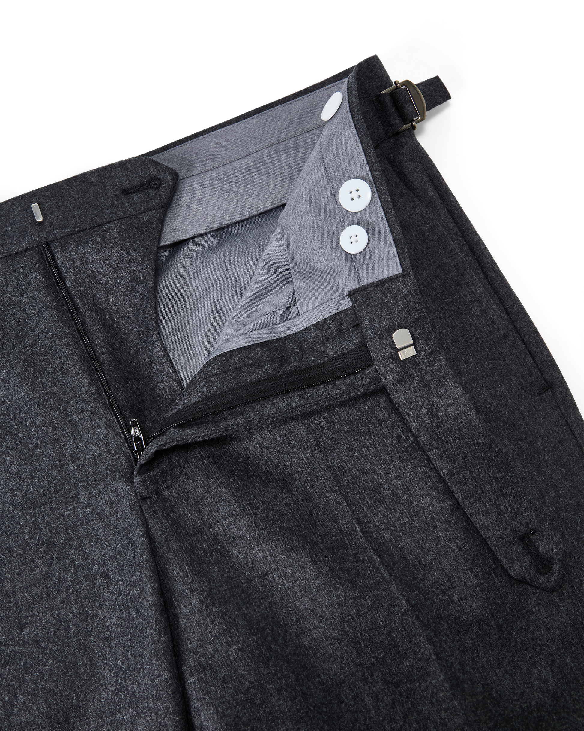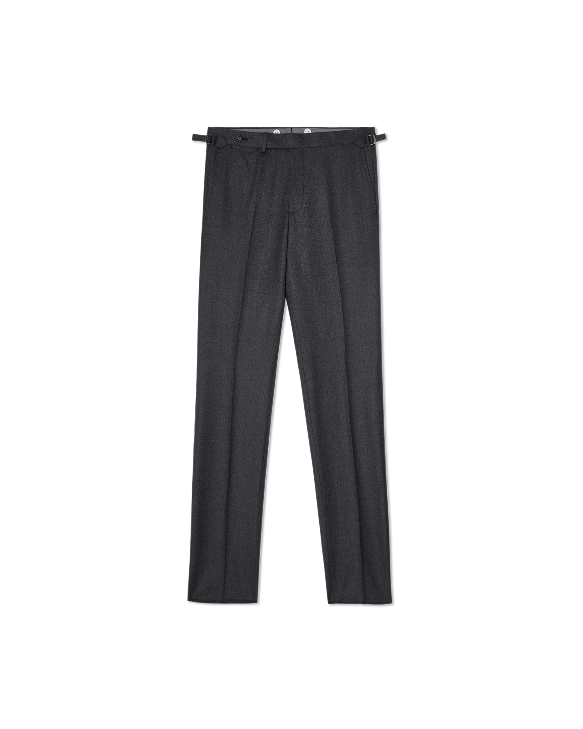 The flannel suit is truly an essential for the autumn wardrobe. With its a mid weight wool flannel and lighter internal construction makes this an ideal suit for the autumn & office environments. Trousers features a mid rise waistline with side adjusters and comes with unfinished hems.