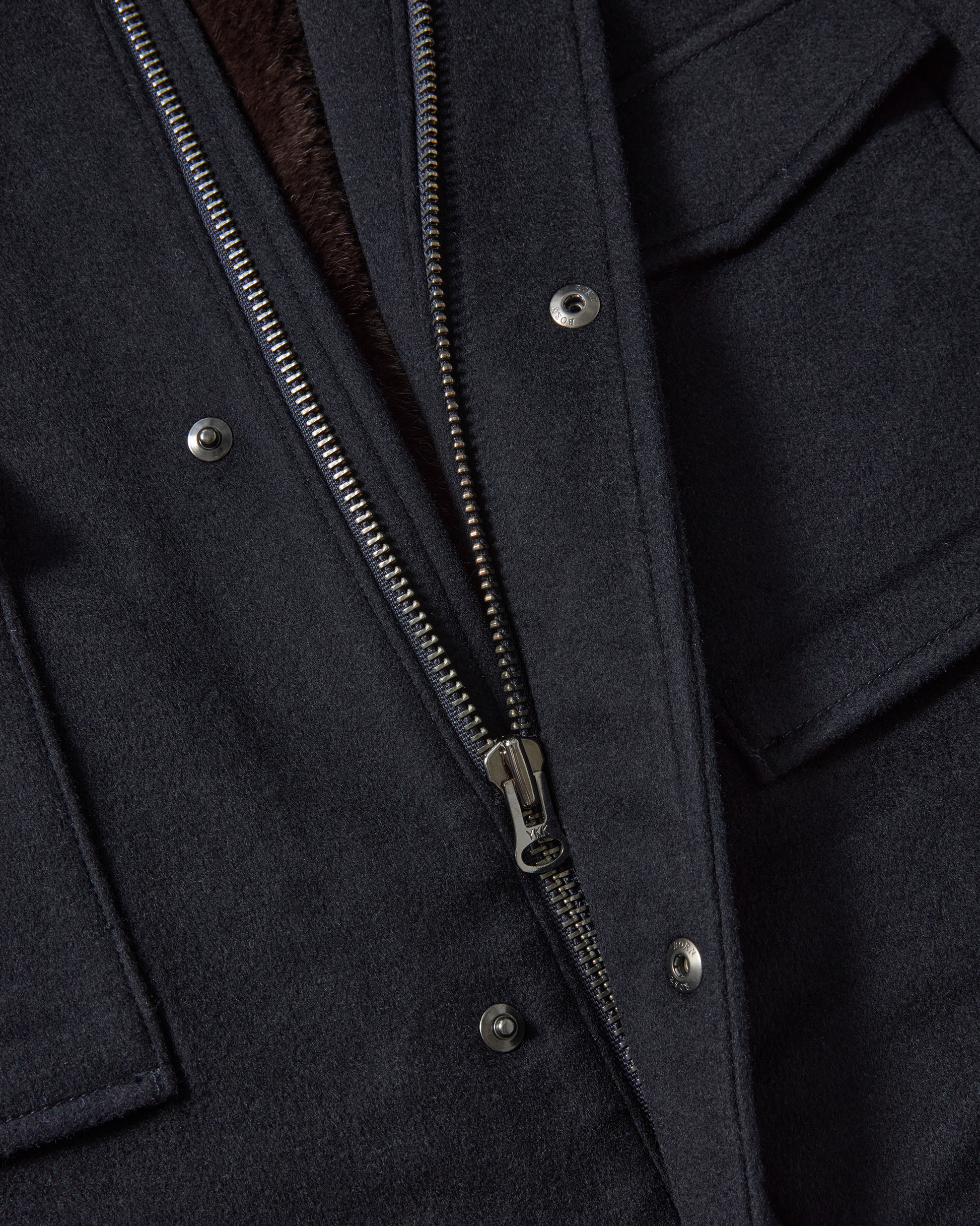 Crafted from an exceptional navy cashmere cloth and finished with a full fur lining, this jacket represents the highest level of our outerwear offering. Designed in a timeless, understated silhouette, it is a statement of discretion, permanence, and uncompromising quality.