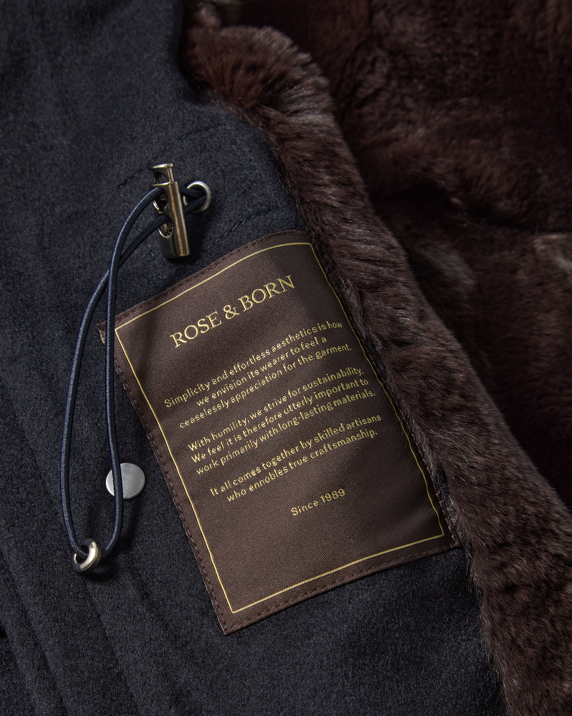 The lining is crafted from genuine fur, chosen for its superior insulating properties and long-term durability. It delivers exceptional warmth with natural breathability, adding depth, substance, and a sense of permanence to the garment. The fur is responsibly sourced, certified and processed in accordance with applicable ethical regulations and standards.
