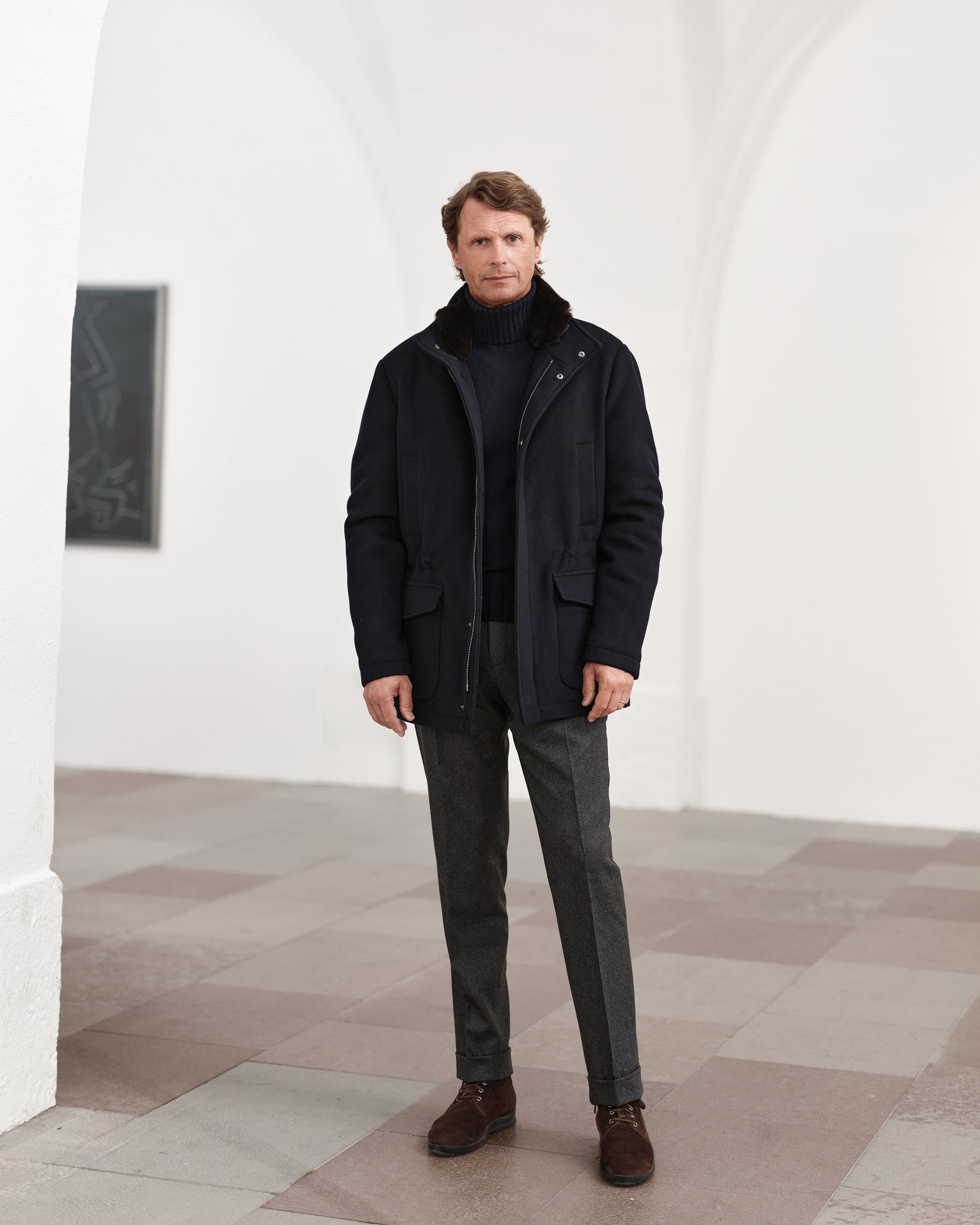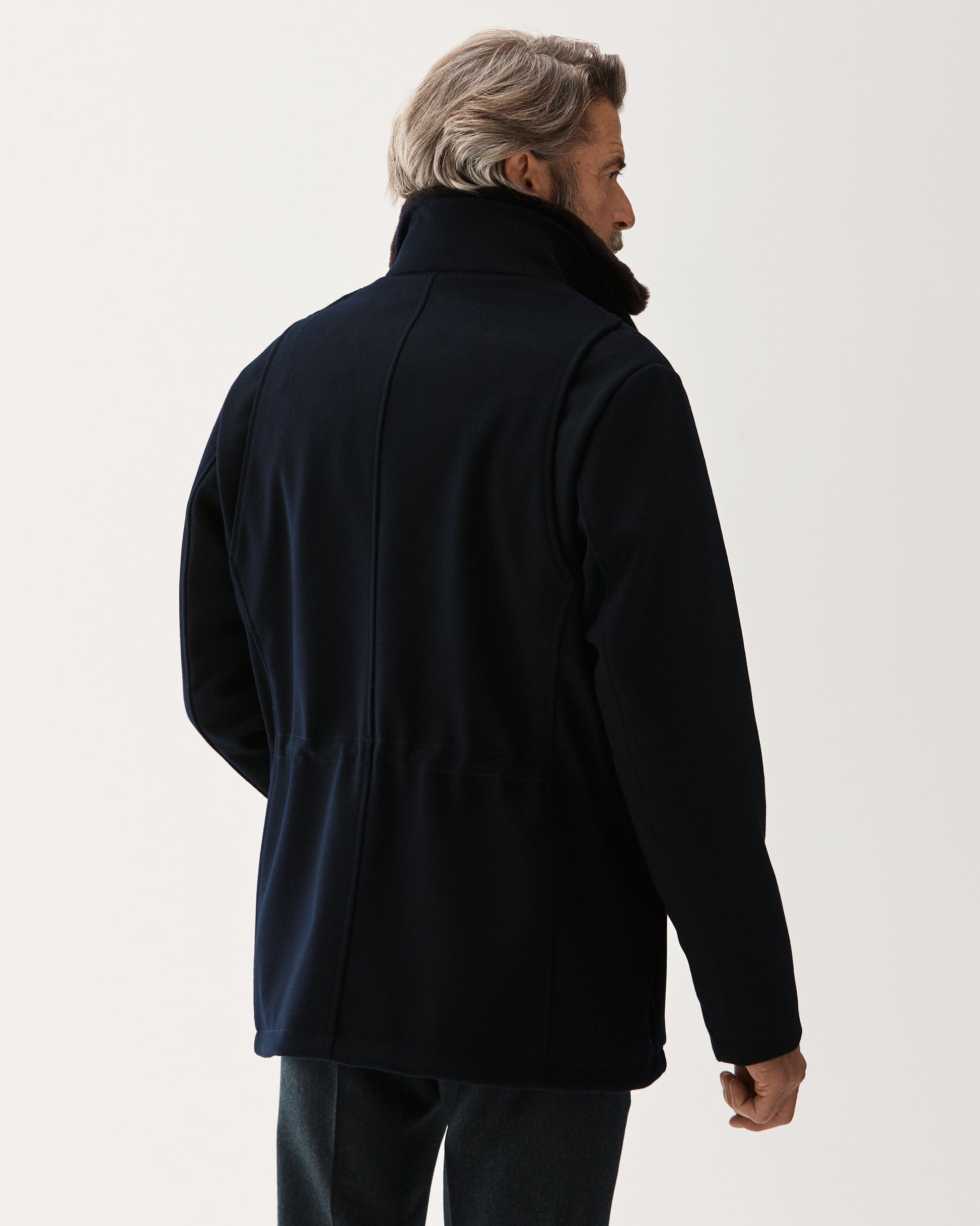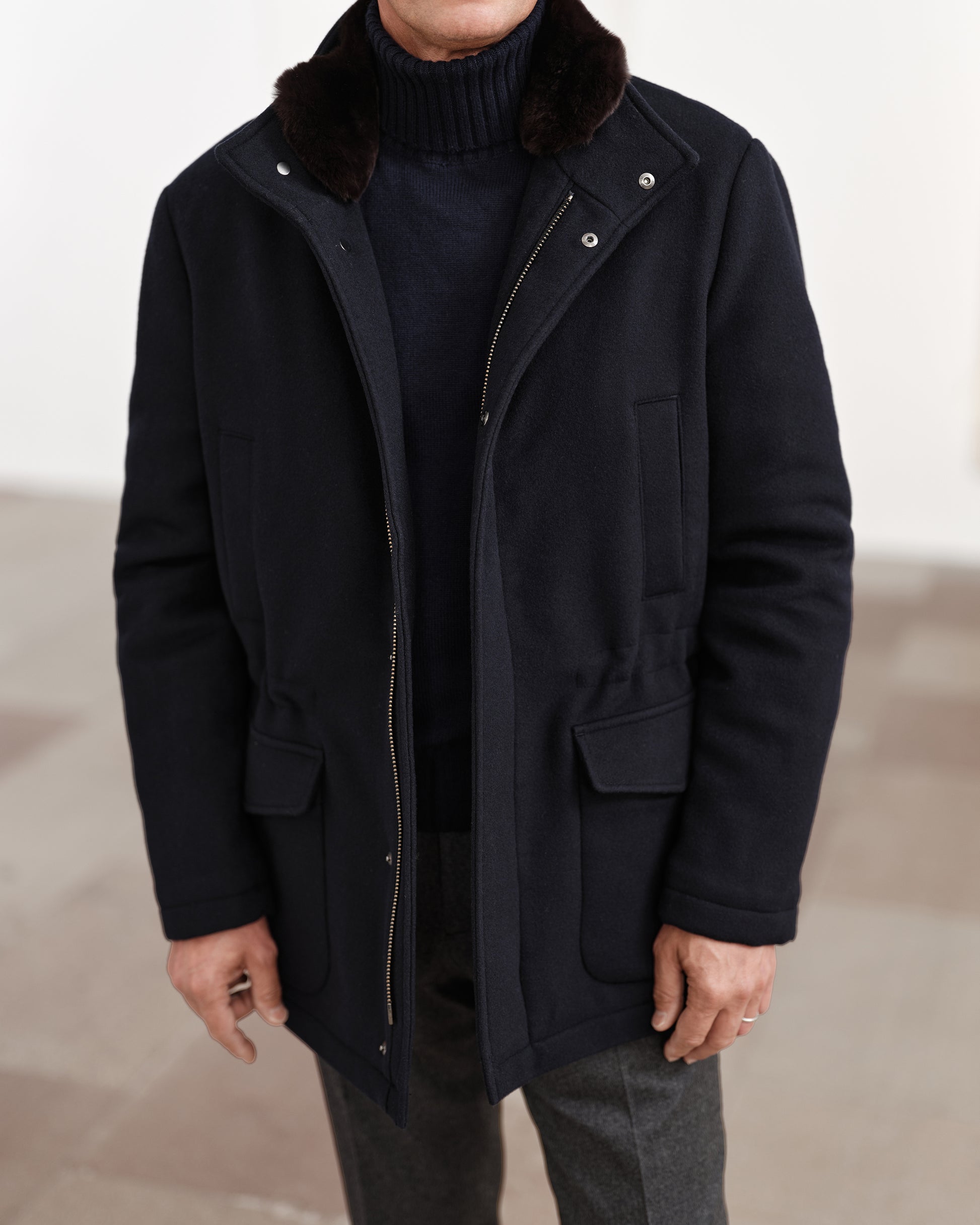 Our signature Field jacket draws inspiration from iconic hunting wear, reimagined as a functional yet city-friendly option. Crafted from water-repellent wool with a soft yet sturdy feel, it features a luxurious removable fur collar, an action back for enhanced movement, and generously sized pockets. Designed with a roomy fit, it’s intended to be worn with a cinched waist for a tailored look. Model is 187cm and wears size 50.