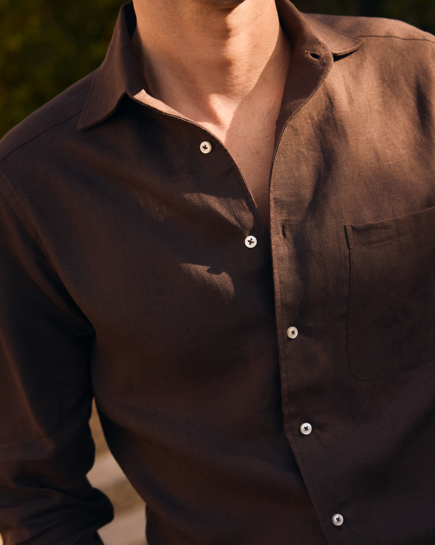 The Resort Shirt remains a seasonal favorite, revived in a beautiful herringbone linen-silk fabric and finished with our signature embossed horn buttons.