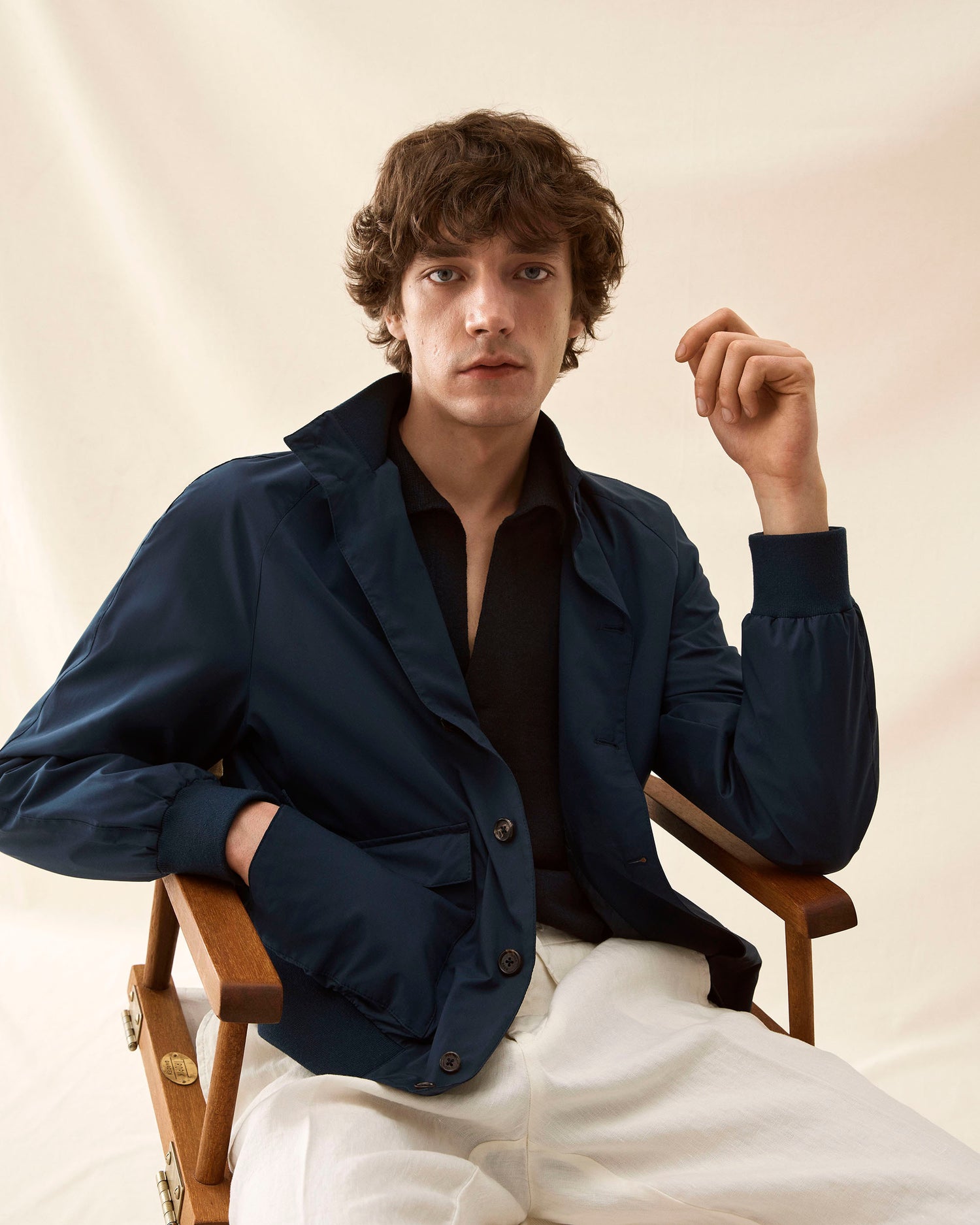 Vår A1-bomberjacka är tillverkad av ett italienskt tekniskt tyg som stöter bort vatten och vind samtidigt som elegansen hos den klassiska vindjackan behålls. Jackan kompletteras med våra exklusiva hornknappar och schweizisk hårdvara.