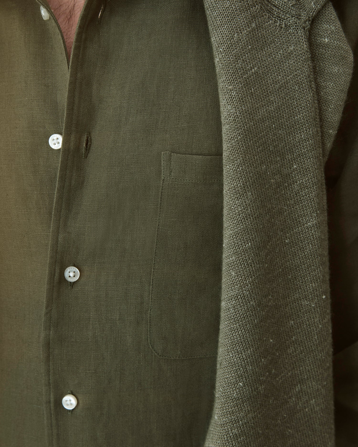 Tillverkad i en majoritet av linne blandat med en superfin italiensk merinoull. Linnet bibehåller den torra känslan samtidigt som ullen ger flexibilitet och form åt plagget.