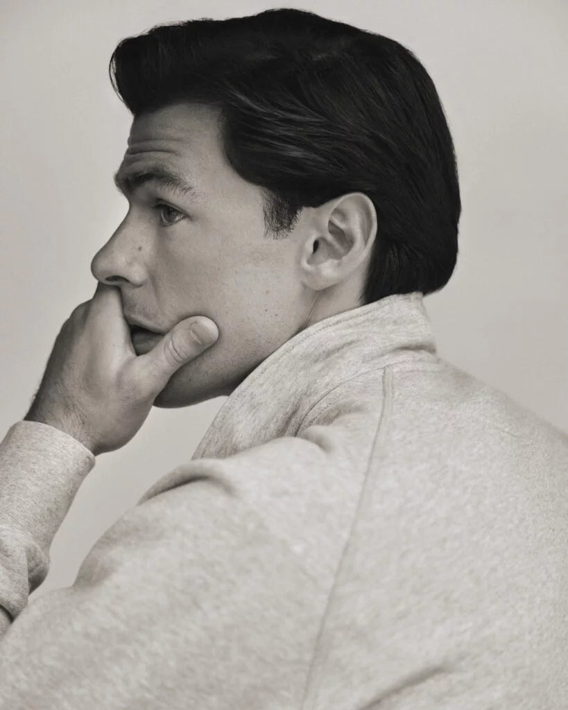 “V’:et fanns från början till av praktiska anledningar. Det placerades vid halsringningen, tillverkad av ribbad bomull för att absorbera fukt från halsen och bröstet, vilket gjorde den idealisk för idrottare och arbetare. Det gav också strukturellt stöd, då sweatshirts ofta drogs över huvudet och den triangulära insatsen hjälpte till att behålla halsringningens form och motstå att den töjdes ut över tid. Med tiden utvecklades detta till ett mer stilistiskt element och blev ett kännetecken för kvalitativa och vintage-aktivitetskläder. I dag är ‘V’:et en nostalgisk hyllning till sweatshirtens arv, en subtil men igenkännbar detalj som signalerar klassiskt hantverk.”