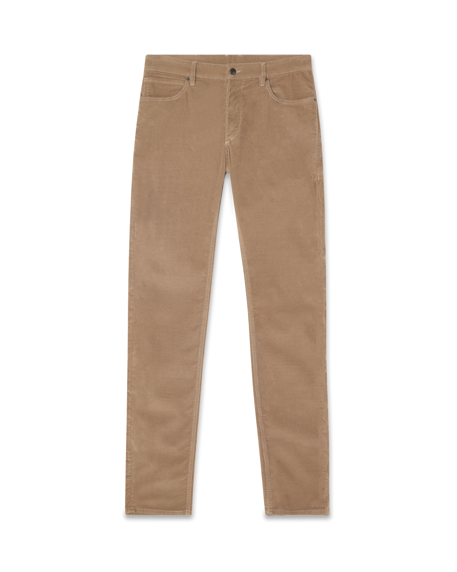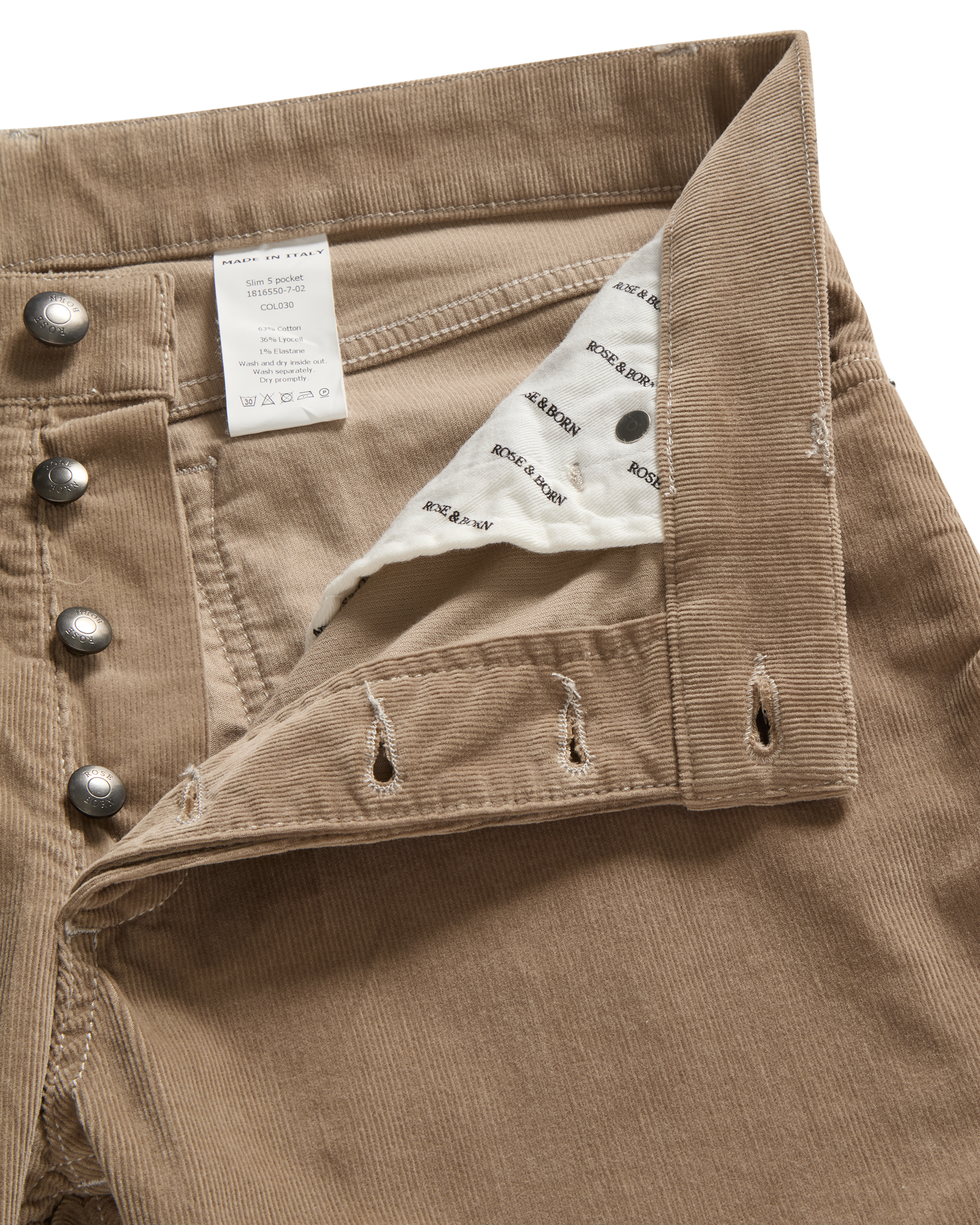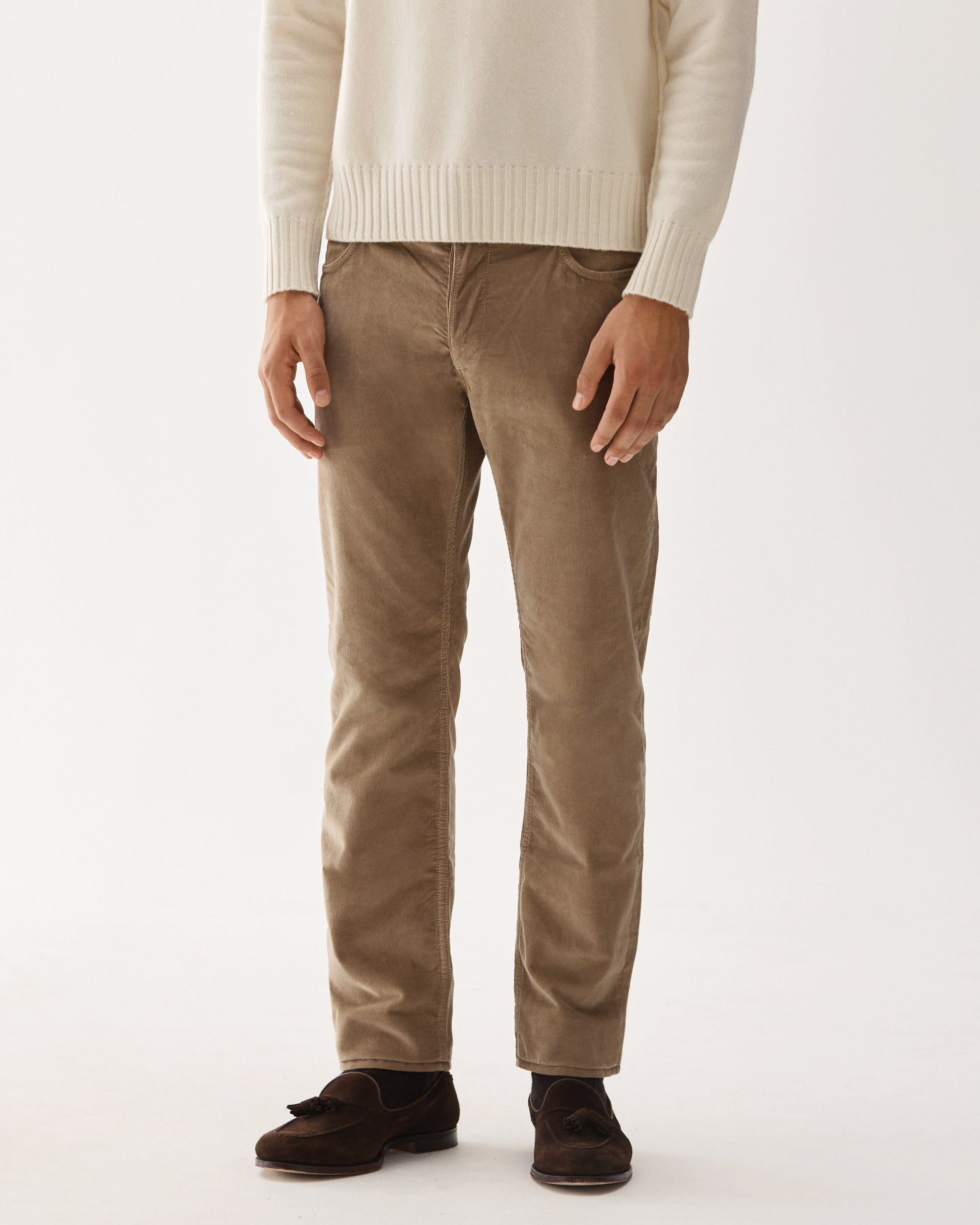 Dessa pincord-byxor är gjorda av ett mjukt och glänsande bomulls- och lyocelltyg. Våra jeans och 5-ficksbyxor är tillverkade i italienska tyger och schweizisk hårdvara. De kommer i en klassisk 5-ficksstil med ett smalt ben som är gjorda för att bäras med nästan vad som helst året runt. Modellen är 189 cm lång, väger 77 kg och bär storlek 32.