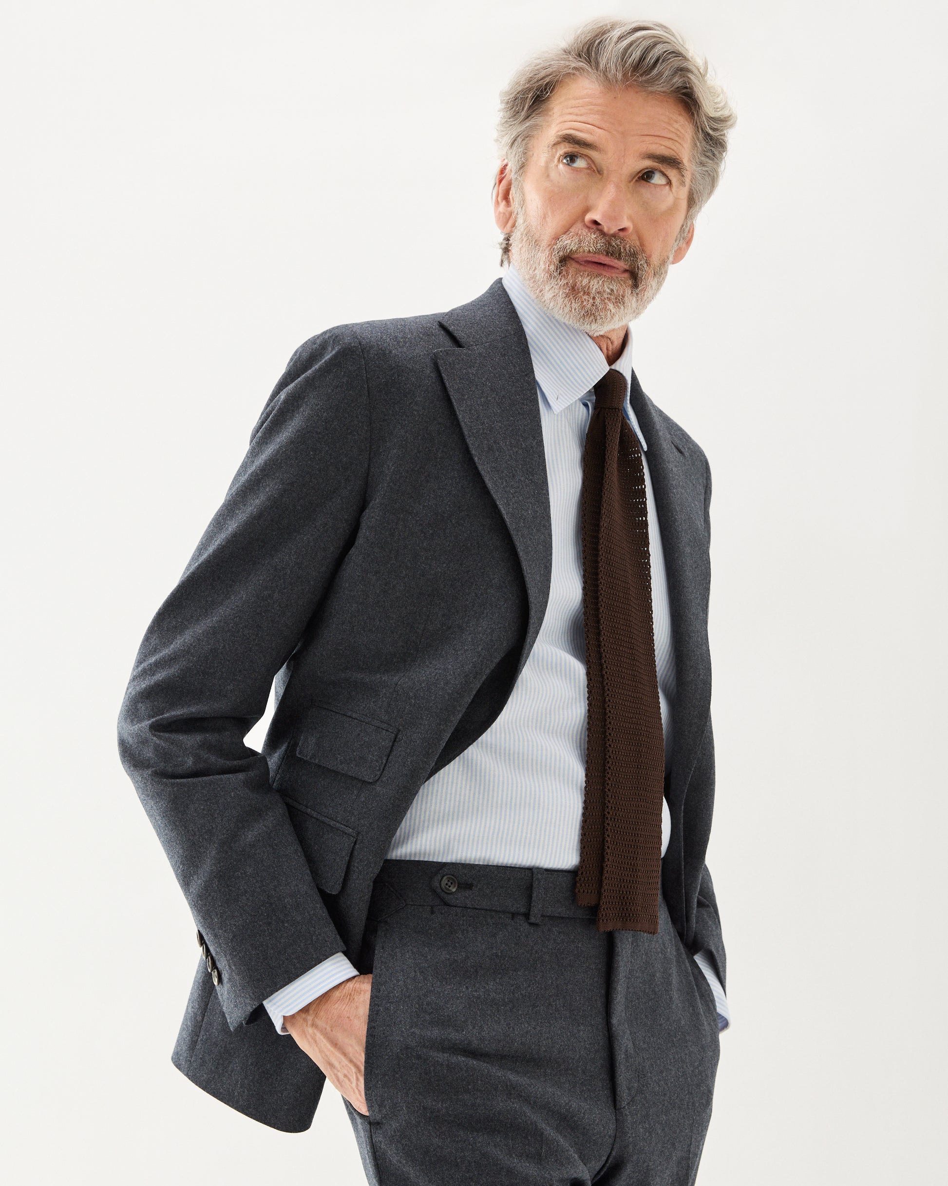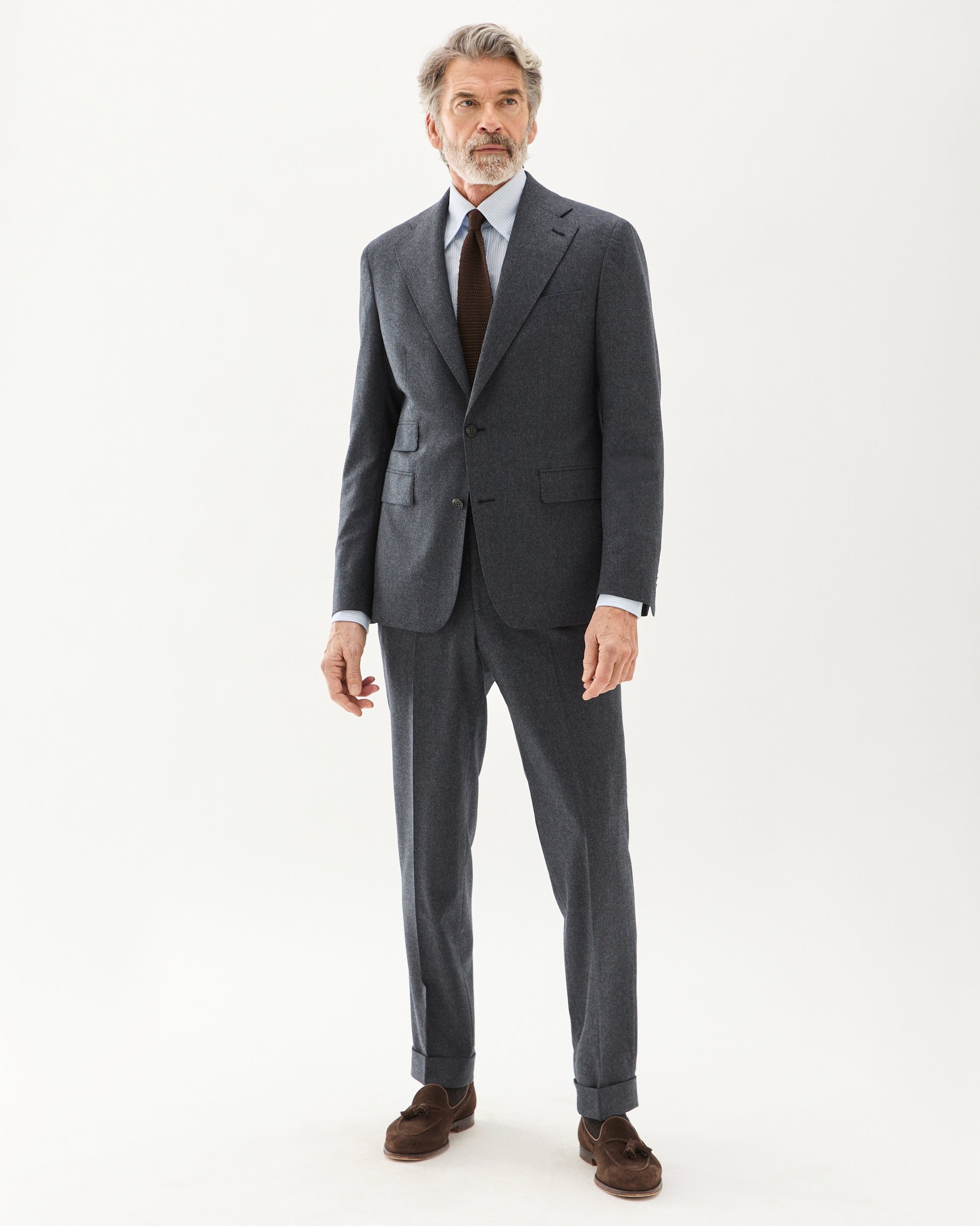 Flanellkostymen är ett måste i höstgarderoben. Med ett medeltjockt ullflanelltyg och en lättare konstruktion är detta den perfekta kostymen för både höstbruk utomhus och kontoret. Byxorna har en mellanhög midja med sidospännen och levereras med ofållade benslut. Modellen är 187 cm lång, väger 75 kg och bär storlek 50.